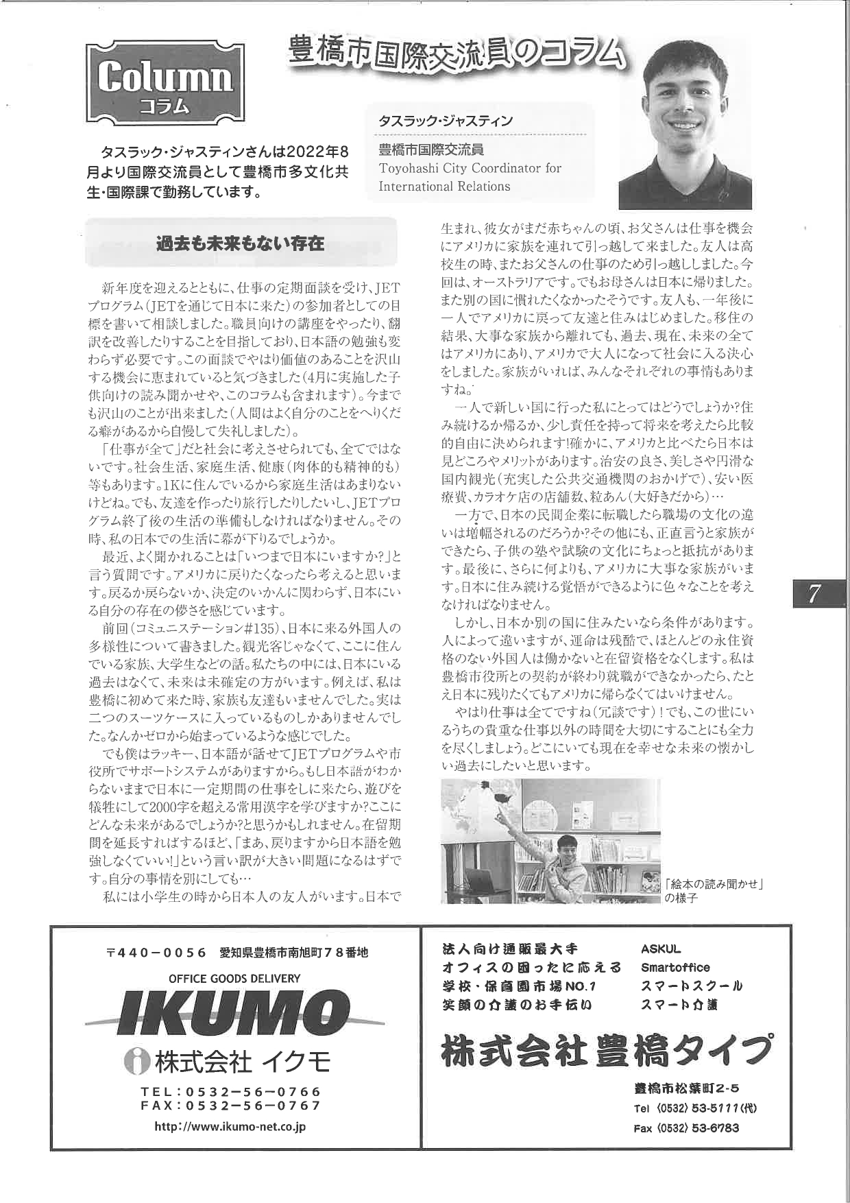 2022年8月、外国青年招致事業(JETプログラム)により、国際交流員として豊橋市に着任しました。アメリカ・ニューヨーク州出身。 市の多文化共生・国際課で通訳や翻訳、小中学校での異文化理解講座授業などに取り組んでいます。
